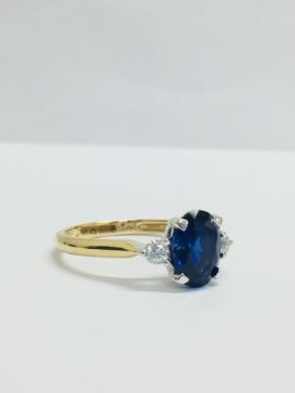 9CT YELLOW GOLD LADIES RING,OVAL CREATED SAPPHIRE,7MMX5MM,2.10GMS 9CT YELLOW GOLD,2 WHITE SAPPHIRE EITHER SIDE,UK SIZE L,UK HALLMARK ,CONDITION FINE