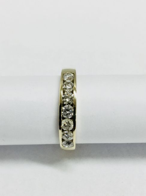 0.70ct diamond eternity style band ring. Set with 7 brilliant cut diamonds, I, si3 clarity. Channel setting in 9ct yellow gold. Hallmarked 375. Ring size O. Valued at £990. Free re-sizing available.