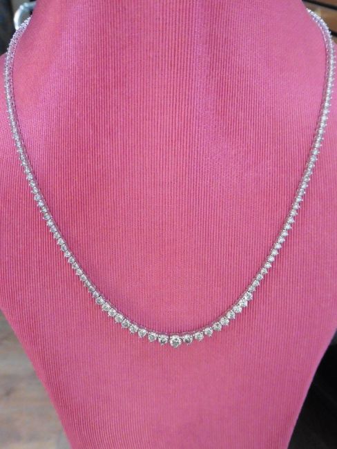 3 claw setting. Graduated diamonds, H colour, Si2 clarity weighing 11.75ct in total. Length 16 inches. Hallmarked 750, 18ct white gold.
