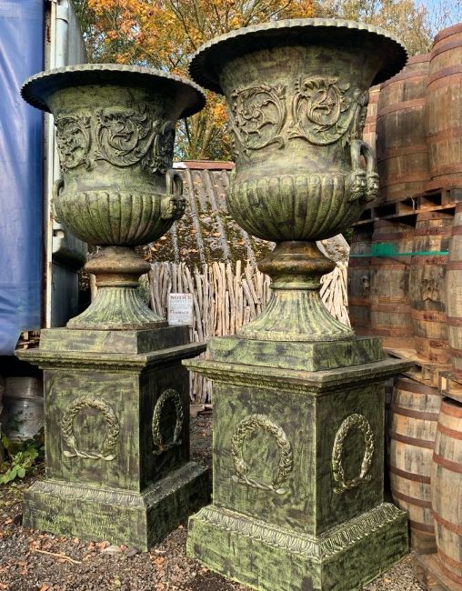 2.8M HIGH HUGE PAIR EXCEPTIONAL CAST IRON MONUMENTAL CAMPANA STYLE URNS ON PLINTH, IN THE MANNER OF ANDREW HANDYSIDE & CO DERBY