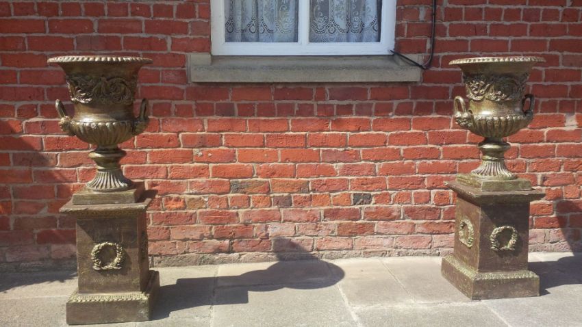 PAIR CAST IRON URNS IN VERDI BRONZE FINISH
