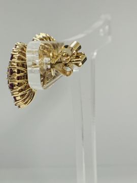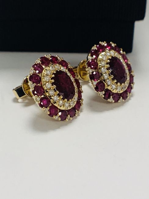 14ct Rose Gold Ruby and Diamond stud earrings featuring, 2 oval cut Rubies (1.47ct TSW), claw set, with 60 round cut Rubies (1.99ct TSW), claw set, and 60 round brilliant cut Diamonds (0.39ct TDW), claw set.
