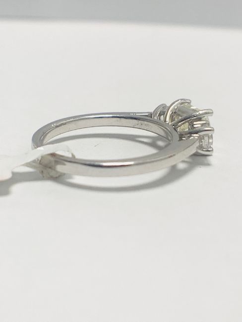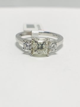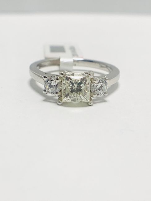 Platinum three stone diamond ring,centre diamond 1ct princess cut diamond,k colour,si2 clarity, clarity.0.50ct in the two smaller round diamonds,h colour and si clarity,,3.9gms platinum 950,London 2019,hallmark,U.K. size L, t(e diamonds are tested as natural clarity enhanced