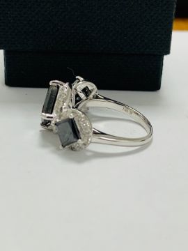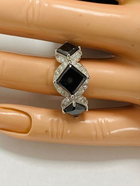 14ct white gold black diamond trilogy ring. featuring three princess cut black diamonds 5.06ct tsw. 48 round brilliant cut white diamonds 0.69ct tdw
