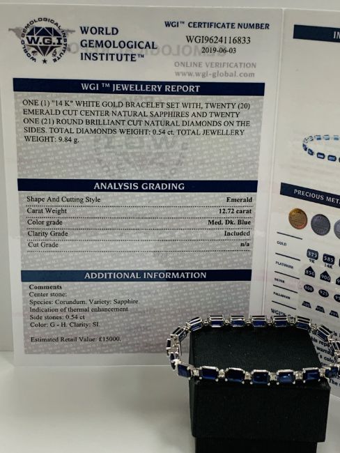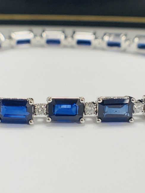 14ct Sapphire and Diamond tennis bracelet featuring, 20 oval cut, blue Sapphires (12.72ct TSW), claw set, with 21 round brilliant cut Diamonds (0.05ct TDW), claw set.