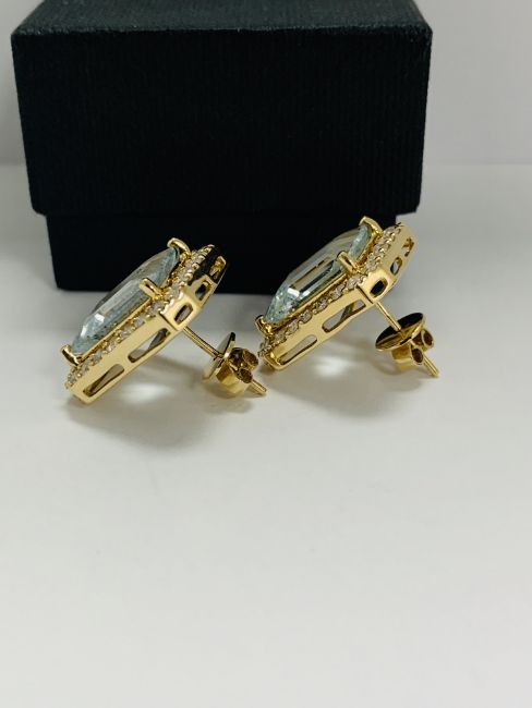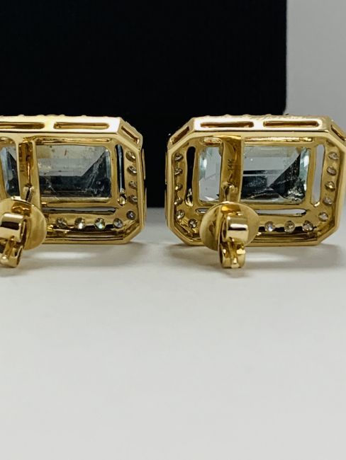 14ct Yellow Gold Aqumarine and Diamond stud earrings featuring, 2 emerald cut Aquamarines (13.00ct TSW), claw set, with 52 round brilliant cut Diamonds (1.50ct TDW), claw set.