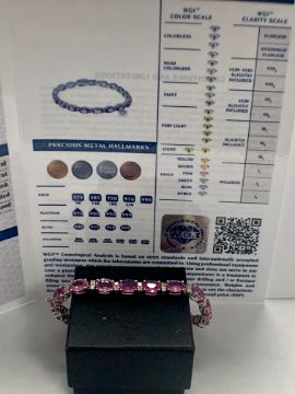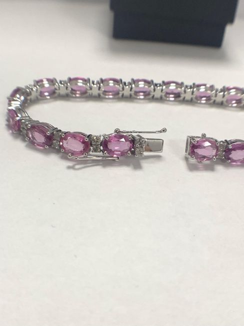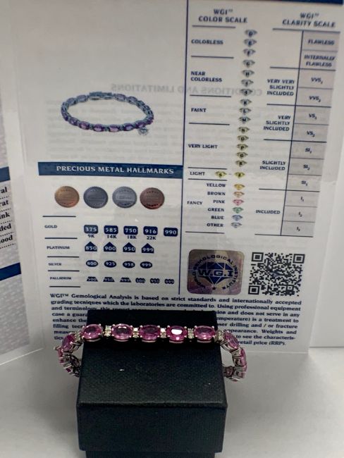 14ct White Gold Sapphire and Diamond bracelet featuring, 19 oval cut, pink Sapphires (15.93ct TSW), claw set, with 38 round brilliant cut Diamonds (1.00ct TDW), claw set.