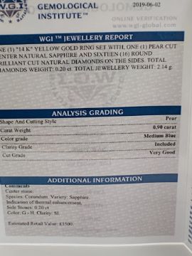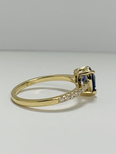 14ct Yellow Gold Sapphire and Diamond ring featuring centre, pear cut, medium blue Sapphire (0.90ct), 3-claw set, with 16 round brilliant cut Diamonds (0.20ct TDW), claw set in band.