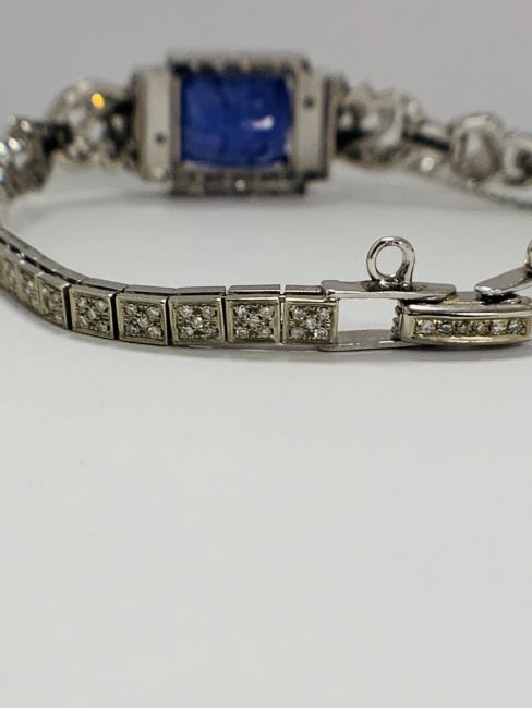 14ct White Gold Tanzanite and Diamond bracelet featuring, oval cut Tanzanite (8.08ct), cclaw set, with 63 round brilliant cut Diamonds (0.39ct TDW), grain set.
