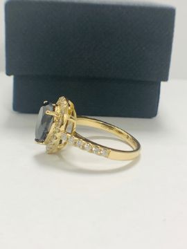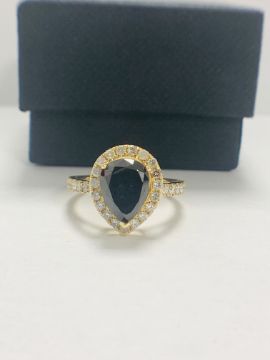 14ct Yellow Gold Diamond ring featuring centre, pear cut, black Diamond (2.13ct), claw set, with 31 round brilliant cut Diamonds (0.45ct TDW), grain set in halo and band.