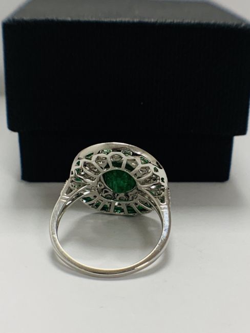 18ct White Gold Emerald and Diamond ring featuring centre, oval cut, green Emerald (2.06ct), claw set, with 18 round brilliant cut Diamonds (0.21ct TDW), grain set, and 27 french cut Emeralds (1.02ct TSW).