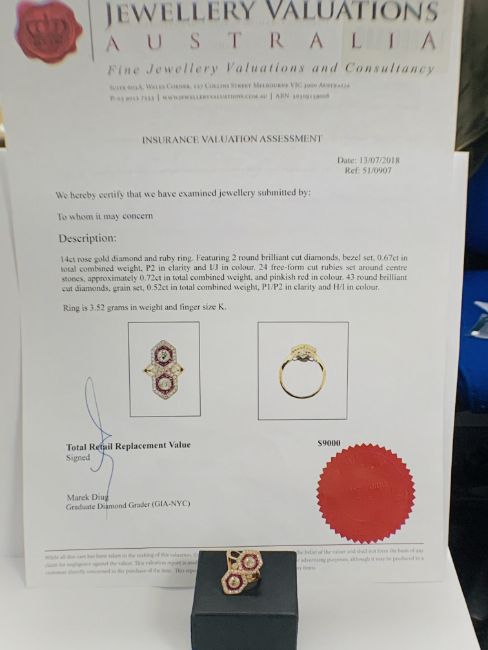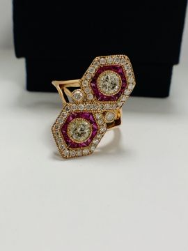14ct Rose Gold Ruby and Diamond ring featuring centre, 2 round brilliant cut Diamonds (0.67ct), bezel set, with 24 free from cut, Natural Rubies (0.72ct TDW), channel set, and 43 round brilliant cut Diamonds (0.52ct TDW), pave set.