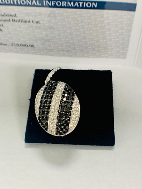 18ct White Gold Diamond pendant featuring 38 round cut, black Diamonds (0.95ct TBDW), grain set, with 78 round cut, white Diamonds (0.90ct TWDW), grain set.