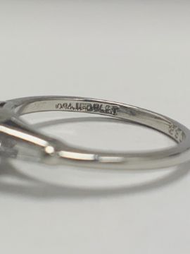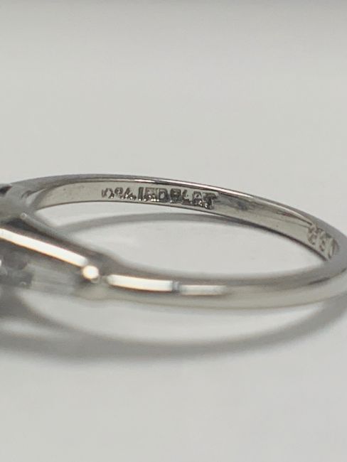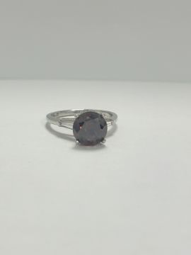 Platinum Diamond ring featuring centre, round brilliant cut, deep orangey brown Diamond (2.15ct), clarity enhanced, 4-claw set, with 2 baguette cut Diamonds (0.20ct), channel set.
