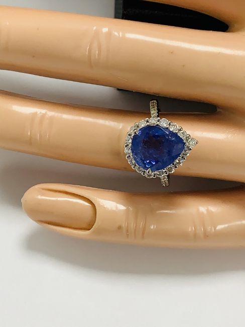 14ct White Gold Tanzanite and Diamond ring featuring, pear cut Tanzanite (4.17ct), claw set, with 28 round brilliant cut Diamonds (0.60ct TDW), claw set.