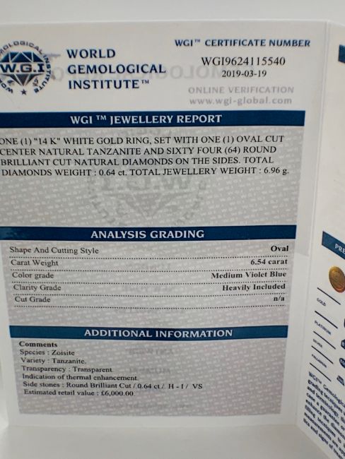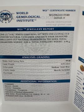 18ct White Gold Tanzanite and Diamond ring featuring centre, oval cut, violet blue Tazanite (6.54ct), 4-claw set, with 64 round brilliant cut Diamonds (0.64ct TDW), grain set.