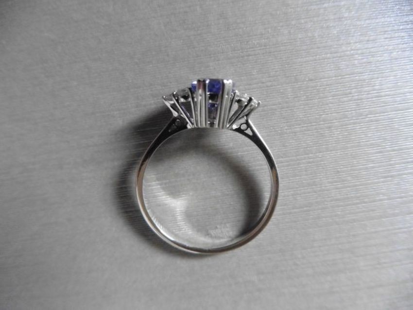 Oval cut tanzanite ( heat treated ) 2.40ct approx with 3 small brilliant cut diamonds set either side. Claw settind. Ring size M.. Can be re-sized free of charge if needed.