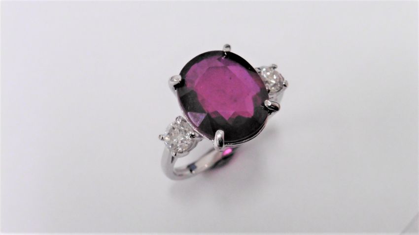 Oval cut ruby ( fracture filled ) with a 0.25ct diamond set either side. I colour and si3 clarity. Claw setting. Ring size N. Sizing available.