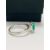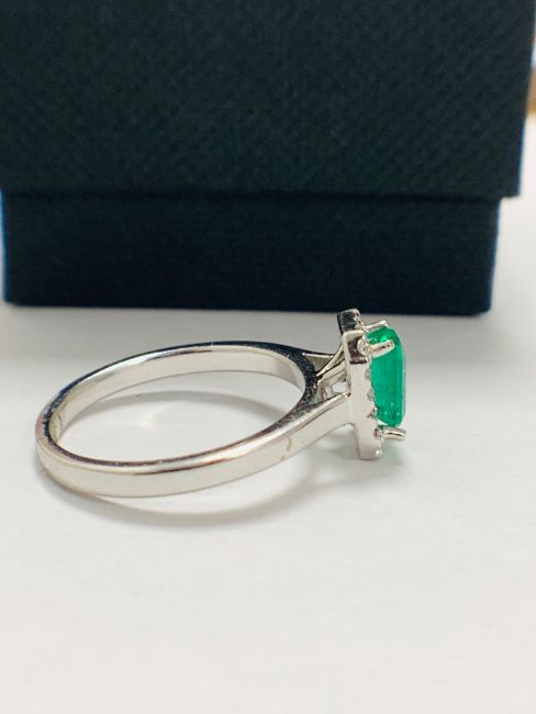 Rectangular cut emerald ( treated ) 0.70ct with a halo setting of small brilliant cut diamonds 0.12ct total. H colourand si2 clarity. Claw setting in platinum. Size M. Free re-sizing available.
