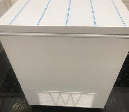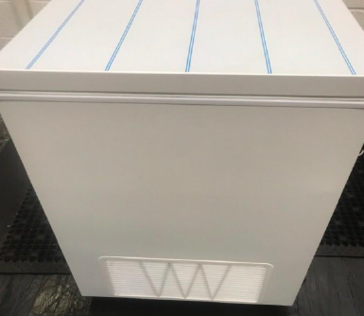 Equipped with lift up stainless lid, handle and lock, defrost water drain complete with 3 wire baskets. Running condition; reached working temperature. Front: panel is dented.Top: in good condition.Right hand side: in good condition.Rear: Dented on the bottom right hand side.Left hand side: in good condition. Interior & Data: three trays, two keys, user’s manual, in good condition.