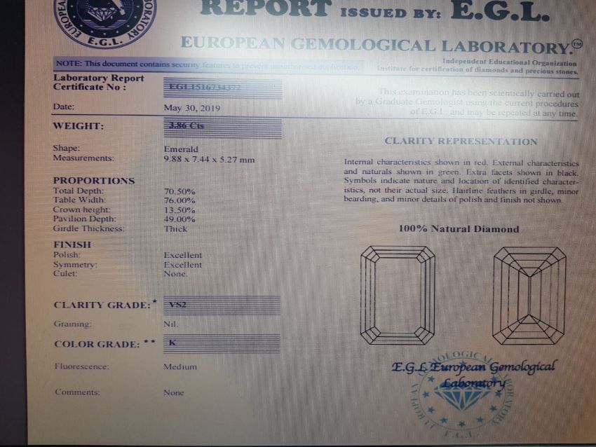 3.86ct Emerald Cut Diamond,Vs2 clarity,K colour,EGL CertificationEGL1516734222