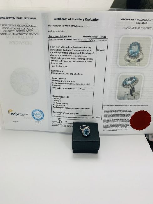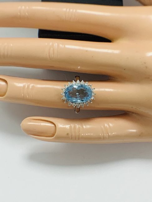 14ct White Gold Aquamarine and Diamond ring featuring centre, oval cut Aquamarine (3.16c), claw set, with 20 round brilliant cut Diamonds (0.34ct TDW), claw set.
