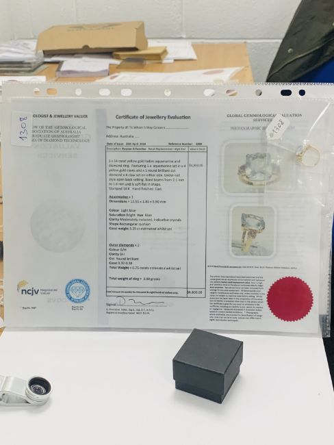 14ct Yellow Gold Aquamarine and Diamond ring featuring centre, cushion cut Aquamarine (5.25ct), claw set, with 2 round brilliant cut Diamonds (0.75ct TDW), claw set.