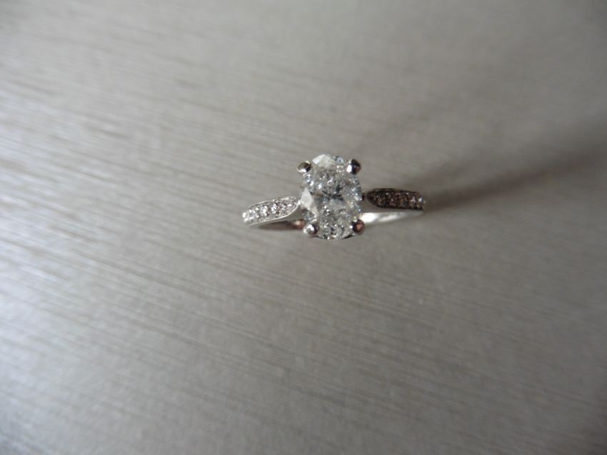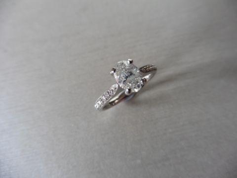 0.82ct oval diamond set solitaire ring. Centre diamond G/H colour, Si3 clarity. Shoulders micro set with brilliant cut diamonds, H colour, si clarity weighing 0.26ct. Set in Platinum, ring size K.