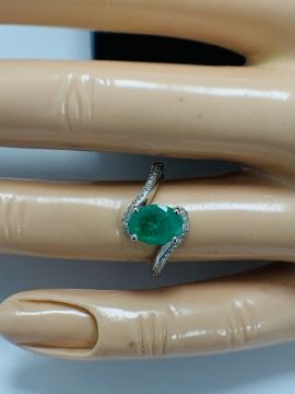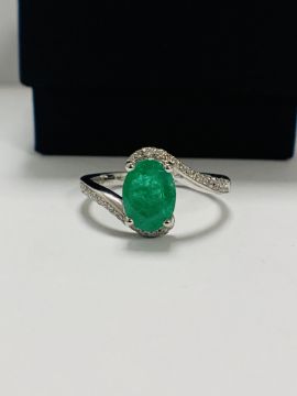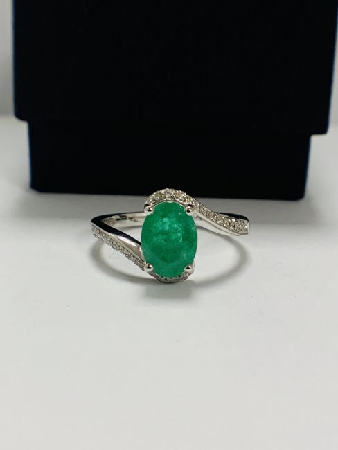 14ct White Gold Emerald and Diamond ring featuring centre, oval cut, medium green Emerald (1.18ct), claw set, with 64 round brilliant cut Diamonds (0.24ct TDW), grain set.