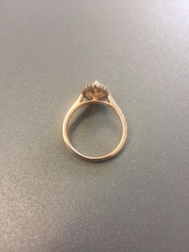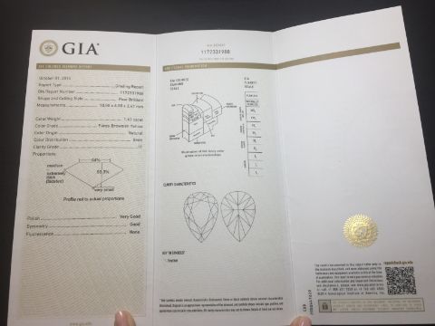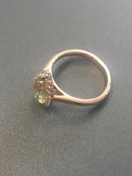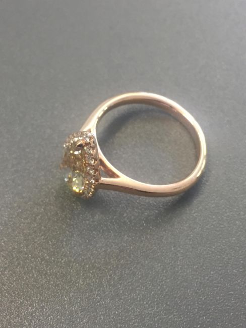 1.47ct pear shaped diamond set ring. Fancy yellow pear diamond, I1 clarity. Set in 18ct rose gold. GIA certificate for centre stone.