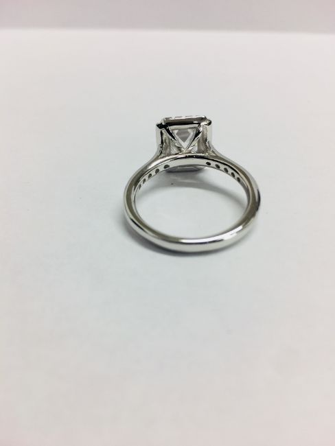 1.2ct diamond solitaire ring set with an emerald cut diamond, H colour and S1 clarity. Set in a platinum 4 claw setting.