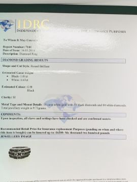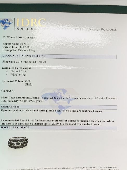 18ct White Gold Diamond ring featuring, 73 round brilliant cut, black Diamonds (1.01ct TDW), with 80 round brilliant cut, white Diamonds (0.47ct TDW).