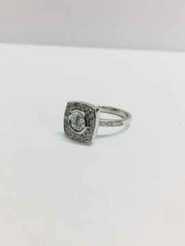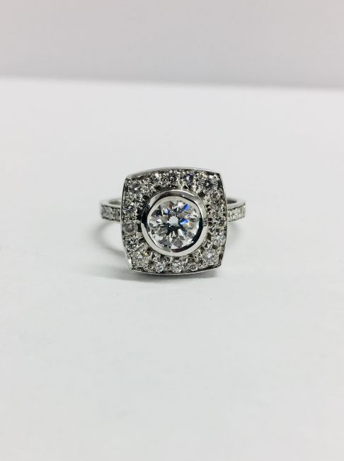 18ct white Gold Halo style diamond ring,0.70ct centre i colour vs clarity,0.25ct si h colour diamonds set in 18ct white gold setting,4.2gms 18ct white gold,uk size K,uk hallmark london 750,centre diamond has undergone clarity enhancement,