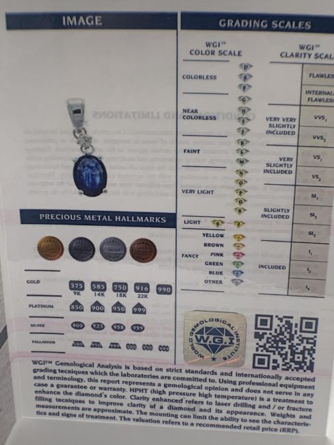 14ct White Gold Sapphire and Diamond pendant featuring oval cut, medium blue Sapphire (1.31ct), 4-claw set, with one round brilliant cut Diamond (0.07ct), 4-claw set.