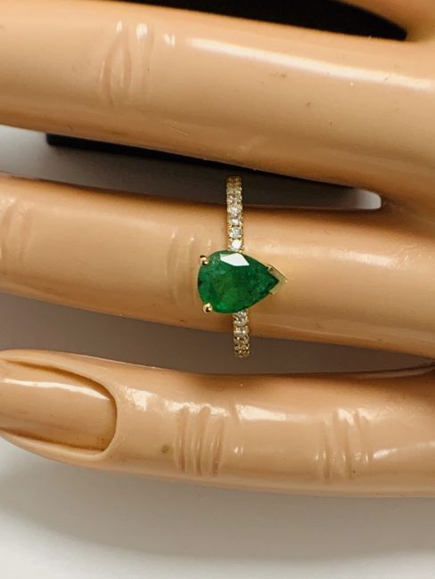14ct Yellow Gold Emerald and Diamond ring featuring centre, pear cut, medium green Emerald (1.23ct), 3-claw set, with 16 round brilliant cut Diamonds (0.19ct TDW), claw set.