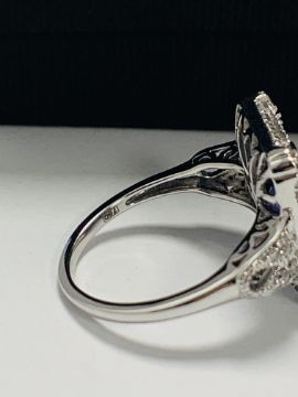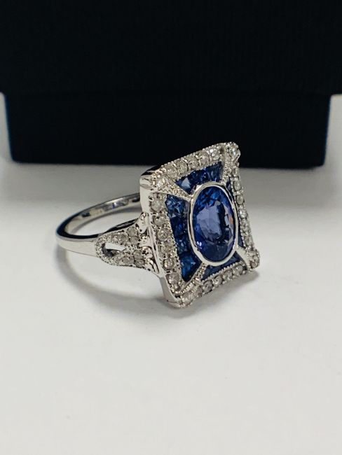 18ct White Gold Tanzanite, sapphire and Diamond ring featiurngg centre, oval cut Tanzanite (0.84ct), claw set, with natural Sapphire (1.88ct TSW), and 38 round brillaint cut Diamonds (0.32ct TDW).