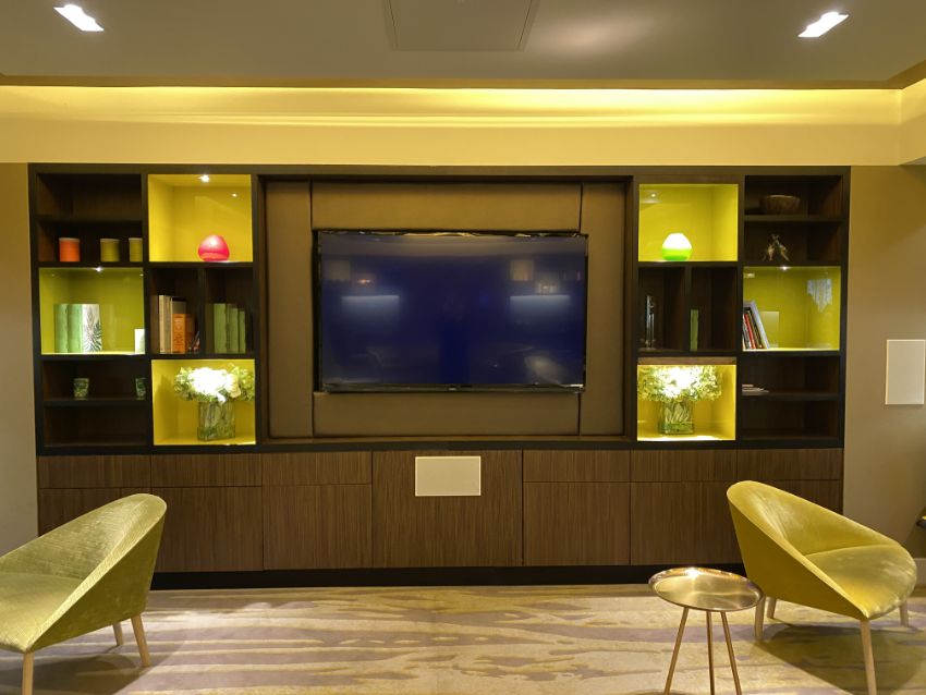 Large Bespoke Media Unit with 6 soft close cabinets, upholstered boarding,includes lighting. TV, Sound system and decorative items are not included. Approx 14ft long, 7.5ft high