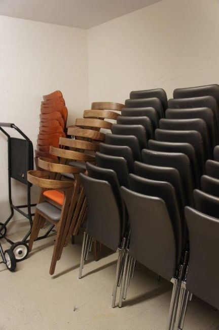| The contents of the Basement store comprising, 7 x Burgess circular flip top table 1800mm dia., 46 x chrome frame chairs, 8 x wooden dining chairs, 15 x wooden frame bistro chairs, 3 x chair trollies |