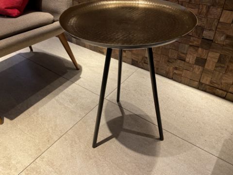 Brass designer table, tripod legs. Approx 53cm in height, 40cm in width.