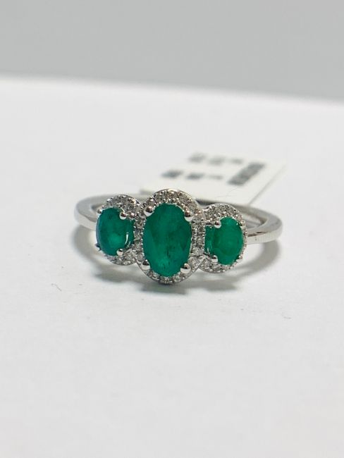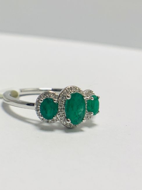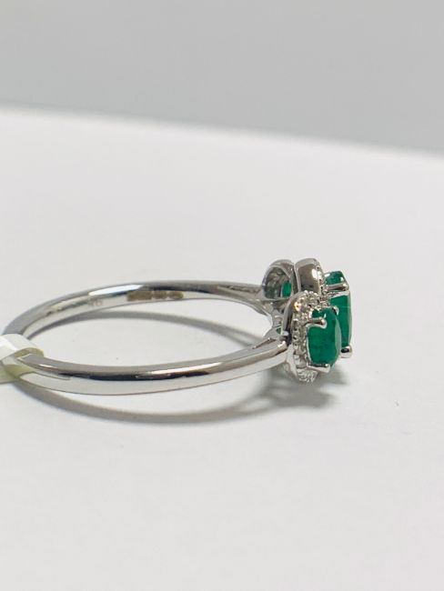 9K White Gold Emerald /Diamond Trilogy Cluster Ring, 42Round diamonds ,0.12CT,i colour,i1 clarity, 3 Emerlads,0.97CT,Natural,2.49gms 9ct White Gold,uk size L,U.K. London hallmark,condition new