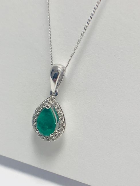 9K White Gold Emerlad and diamond pendant and 9ct necklace, 20 Round Diamonds ,/0.09ct, 1 Emerald 0.38ct,0.60gms 9ct White Gold,16” 9ct White gold curb necklace,0.5gms,uk hallmarkcondition new