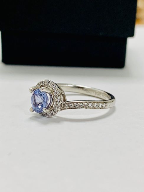 0.70Ct Natural Sapphire,5Mm Round,Platinum 950 Setting,3.43Gms,36 Round Brilliant Cut Diamonds Natural G Colour Vs Clarity,Uk London Hallmark 2018 950,Condition Fine,Uk Size K