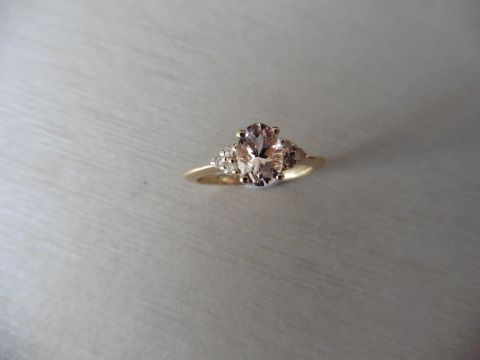 Oval Cut Morganite In The Centre With 3 Small Round Cut Diaonds Set Either Side, H/I Colour,Si2 Clarity. Set In 14Ct Yellow Gold Size M.