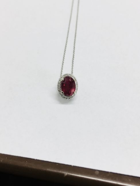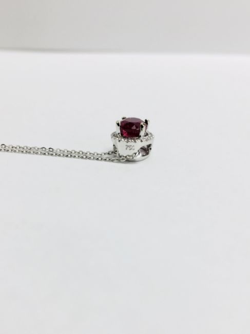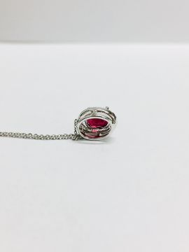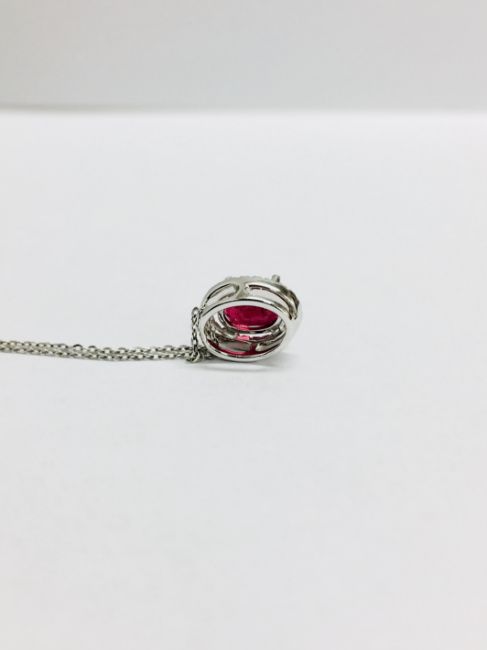 Oval Cut Ruby ( Glass Filled ) In The Centre, 2.40Ct, With A Halo Setting Of Small Brilliant Cut Diamonds, H Colour, Si Clarity, Weighing 0.13Ct. Set In 18Ct White And Mounted On A 9Ct Chain.