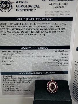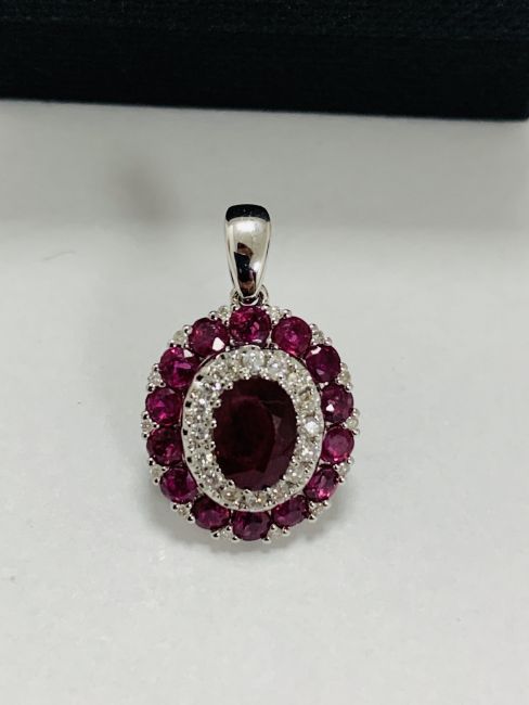14ct White Gold Ruby and Diamond pendant featuring centre, oval cut, vivid red Ruby, claw set, with 14 round cut, vivid red Rubies (2.51ct TSW), claw set, and 20 round brilliant cut Diamonds (0.20ct TDW), claw set.