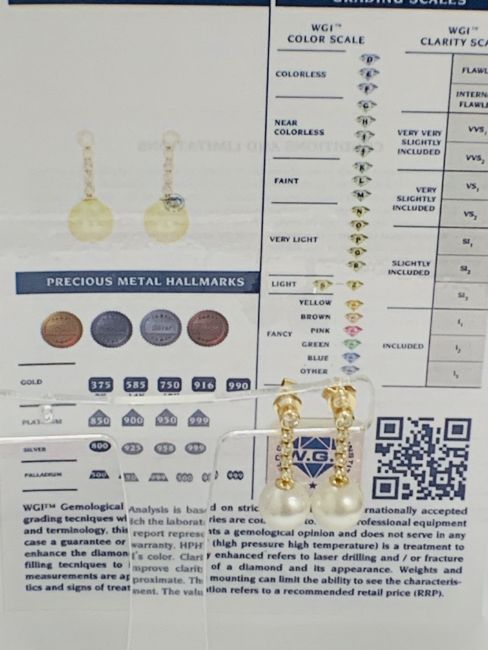 14ct Yellow Gold Pearl and Diamond earrings featuring, 2 white Pearls, with 8 round brilliant cut Diamonds (0.10ct TDW), bezel set.