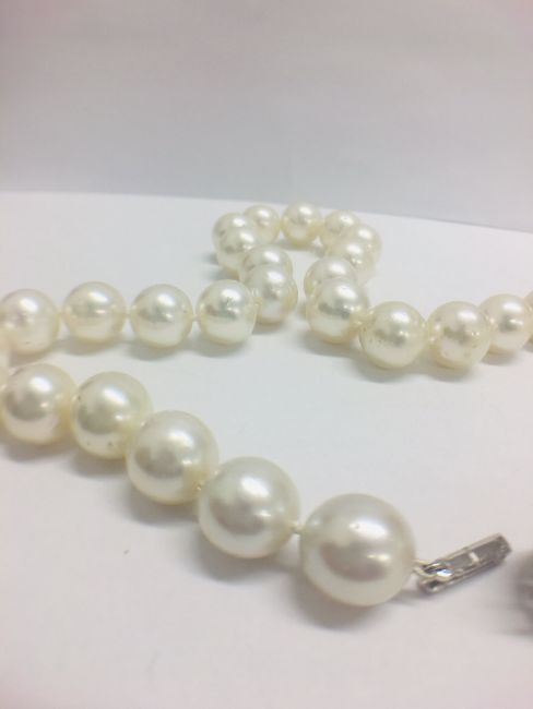strand 35 south sea pearls with 14ct white gold filagree style ball clasp featuring 4 diamonds round brilliant cut