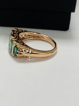 14ct Rose Gold Emerald and Diamond ring featuring centre, 5 oval cut, medium green Emeralds (2.16ct TSW), bezel set, with 8 round brilliant cut Diamonds (0.09ct TDW), grain set.