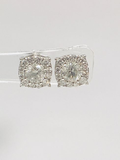 18ct White Gold Diamond earrings featuring centre, 2 round brilliant cut Diamonds (1.39ct), Clarity P1, Colour G/H, claw set, with 24 round brilliant cut Diamonds (0.49ct), Clarity SI, Colour G/H, grain set.