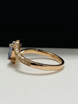 14ct Rose Gold Sapphire and Diamond ring featuring centre, oval cut, blue Sapphire (1.10ct), claw set, with 64 round brilliant cut Diamonds (0.19ct TDW), pave set.